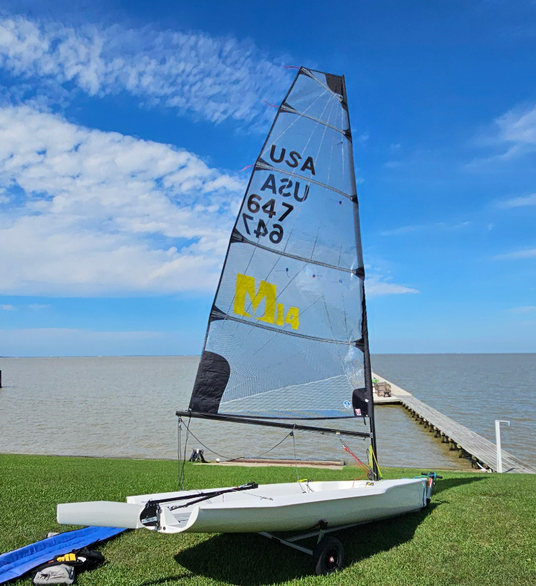 LIKE NEW! Sailed only 3 times. Inside storage. Gold and Red USA lettered sails and masts. M14 Dolly, full deck cover, rudder, tiller and mast bags. Ronstan Tiller Extension 40"